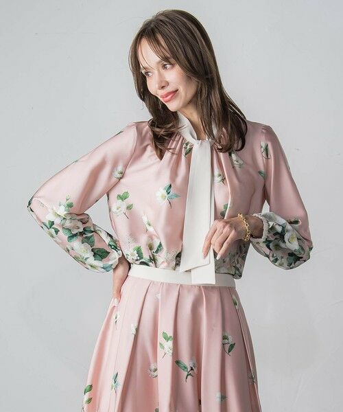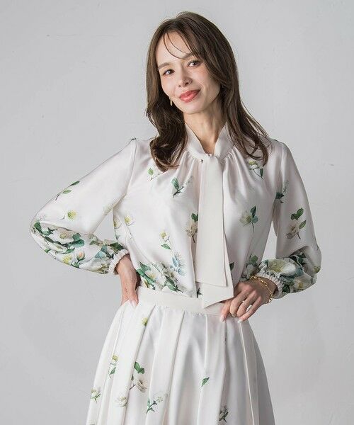 光沢感のある上質なサテン素材に、京都で丁寧に仕上げたオリジナルのクリスマスローズ柄をパネルプリントで贅沢に施したブラウスです。