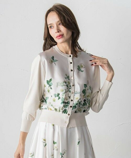 前身頃にのみオリジナルのクリスマスローズ柄プリント生地をあしらった、上品で華やかなニットカーディガン。