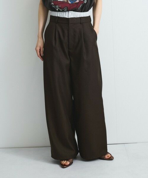 シャツ地ウエストとのダブルデザインになったレイヤード風パンツデザインのルーズトラウザーは、