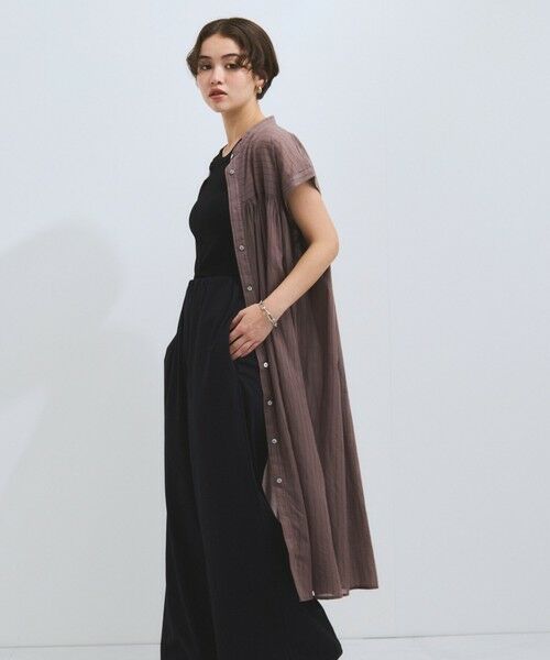 前開きデザインのシャツデザインワンピースはバスト位置で切り替え、ギャザーを入れたデザインに。