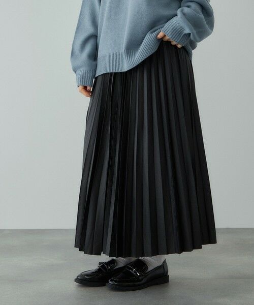 レザーのような表情が特徴的な合繊素材を使用したプリーツスカートです。