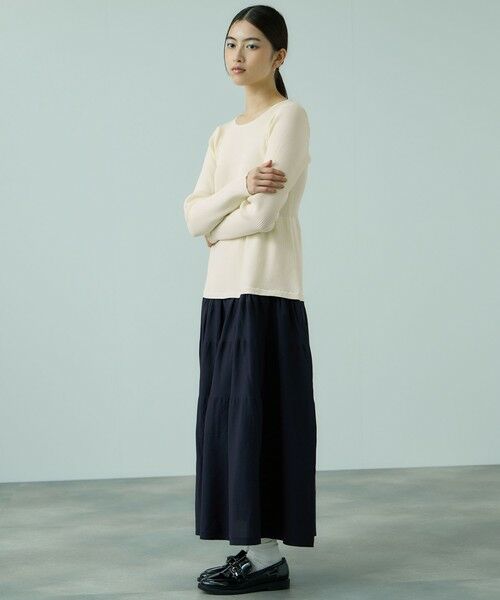 トップス部分とスカート部分で編地に変化をつけて、同素材ながら異素材で切り替えたような印象の一枚です。