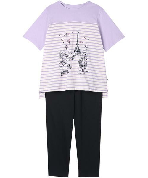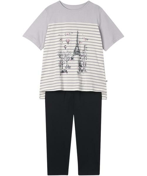 ・トップスはシンプルなボーダーに手描きタッチのパリの街並みをプリント