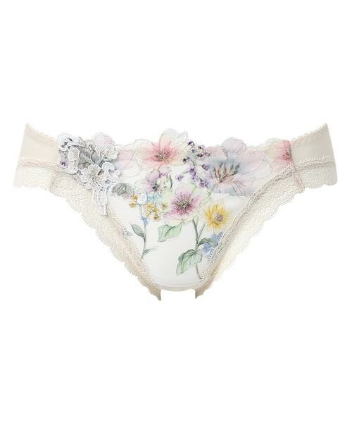 -麗しのバラ園- モナコ日差しにあたたかみが増して春の訪れを感じる季節。モナコのバラ園では花々が咲きはじめ、やわらかな香りに満たされます。鳥のさえずりや楽しげに舞う蝶が出迎えてくれる庭園に咲く色とりどりのバラを、豪華な立体アップリケや多色使いのプリントで華やかに描きました。・フロントは裏打ち付きで透けにくい・春の訪れを感じるような華やかな彩りのプリント&ラメ糸のチュールエンブロイダリーレース・サイドにはケミカルアップリケをあしらった華やかで豪華なデザイン
