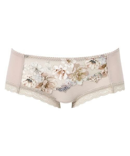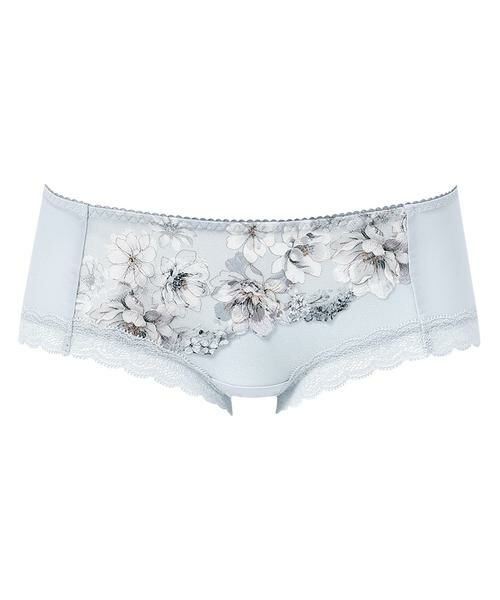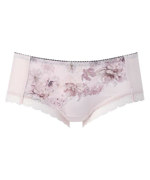 ●はきごこちがよいバックはやわらかく伸びるナイロンベア天竺素材で、はきごこちがよい「リボンブラ 脇すっきり(BXB443)」とペアコーデが楽しめるボーイレングスショーツ。花の美しい瞬間を切り取った、押し花のようなレースで華やかに。