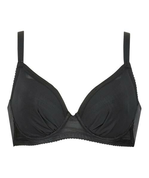 ボリュームのあるバストの高さを抑えコンパクトにまとめるので、薄手のシャツやブラウス、ニットなどをすっきり着こなしたいときにおすすめ。シンプルなデザインとバック上辺の折り返し始末でアウターにひびきにくく、シャープでスタイリッシュなデザインです。