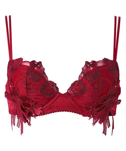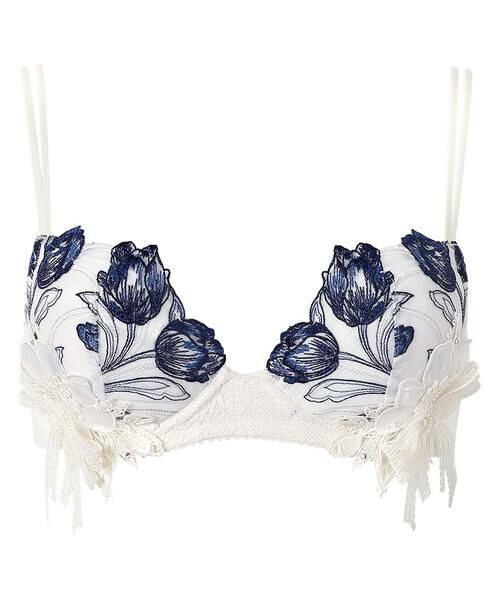 カップレースに輝くラメ糸を織り込み、お花のアップリケにはきらめくラインストーンをあしらった、華やかでラグジュアリーな仕上がり。スケッチのような情緒的で美しいチューリップ柄が、ブーケをイメージさせるデコラティブなデザインです。重なり合うドレッシィなアップリケがポイント。立体的で存在感のあるリボンアップリケがアクセントとなり、特別感を一層引き立てます。