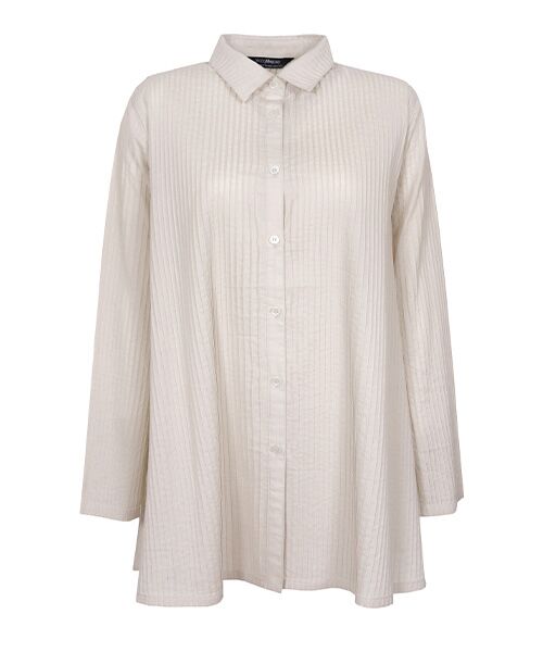 薄手で柔らかなポプリンの総ピンタックブラウス。Aラインですっきりして見えます。ヒップが隠れる安心丈で夏の羽織物としてもおすすめです。豊富に色をとりそろえました。