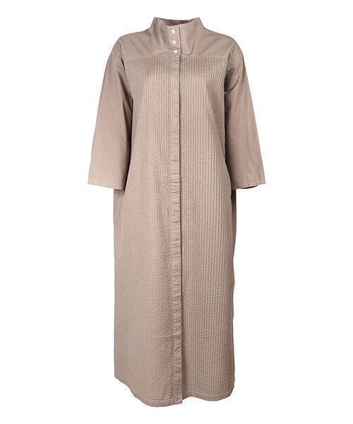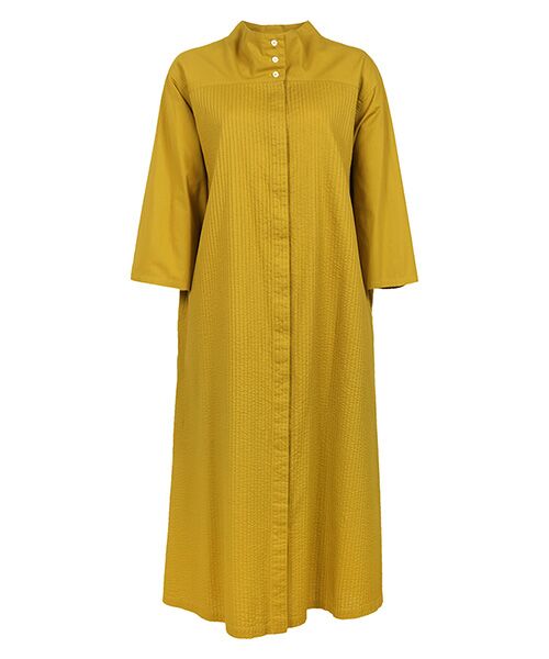 フェイスまわりをすっきり見せるボトルネックの前開きワンピース。淑女ムードのソフトAラインシルエットに、印象的な3つボタンが絶妙なカジュアル感をプラスしています。ヨークと袖を無地にすることで、胸下の端正なピンタック部分とのコントラストが生まれ、シンプルながら存在感のある1枚に。