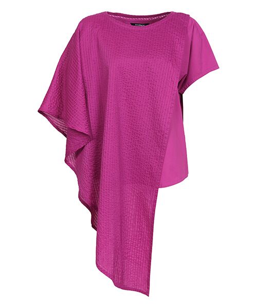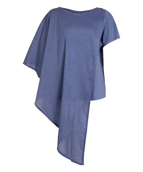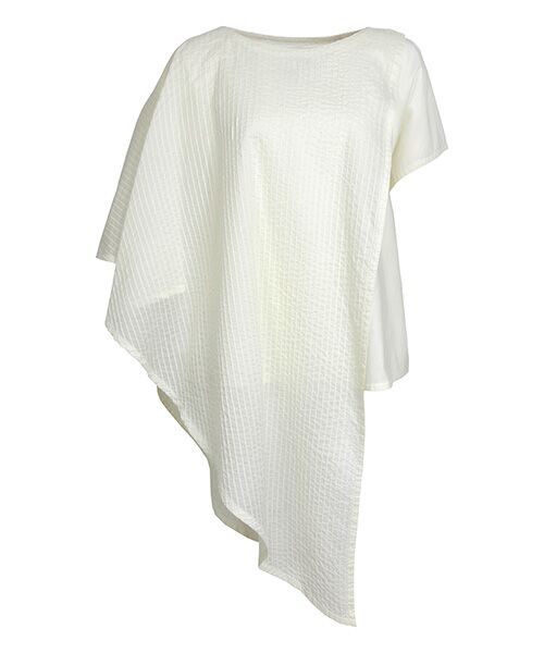 シンプルなTシャツに、羽衣のような透け感のあるピンタックケープを重ねたレイヤードトップス。肩先のボタンで取り外しが可能で、着方のアレンジが楽しめます。 インのTシャツはしなやかなローン素材を使い、袖のフレア感や品の良いネックラインでキレイめな印象に。 ケープをプラスすることで、ピンタックが透けて繊細な表情を作り出し、美しいドレープがリッチでエレガントな空気をまといます。 レイヤードによって丈感と奥行きに変化があるため、様々なボトムにマッチ。スリムからワイドまで幅広く合わせることが可能です。