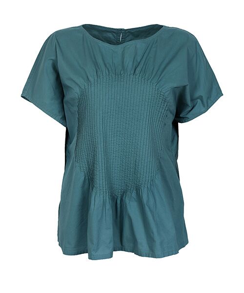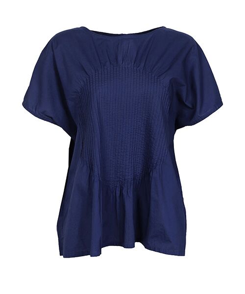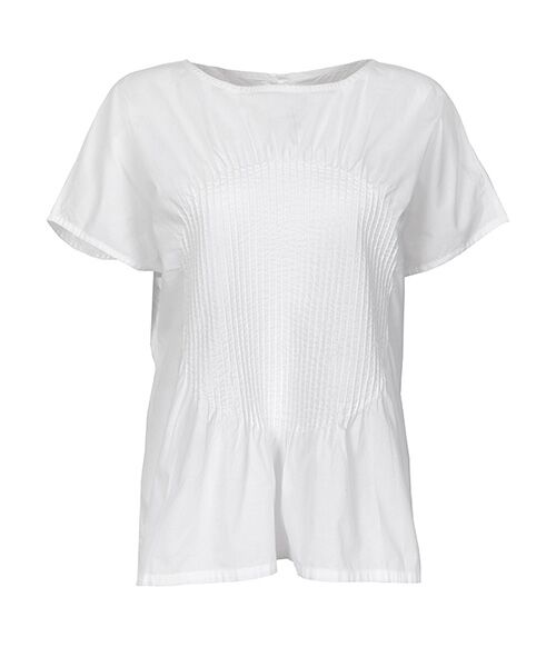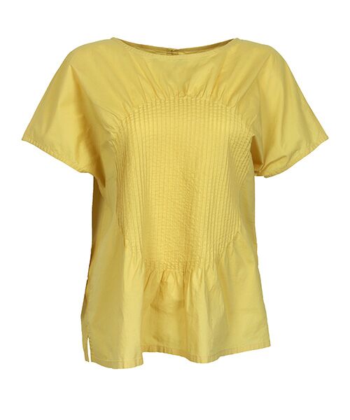 途中止まりのピンタックテクニックで、太陽のような円のモチーフをあしらったトップス。 自然にシルエットがシェイプされ、余裕のある着心地ながら全体がすっきり見えます。 シンプルな中に個性が光るデザインは幅広く着まわしを楽しめ、明るいカラーで夏らしさを感じられる1枚です。