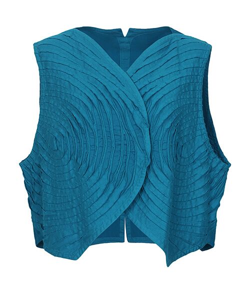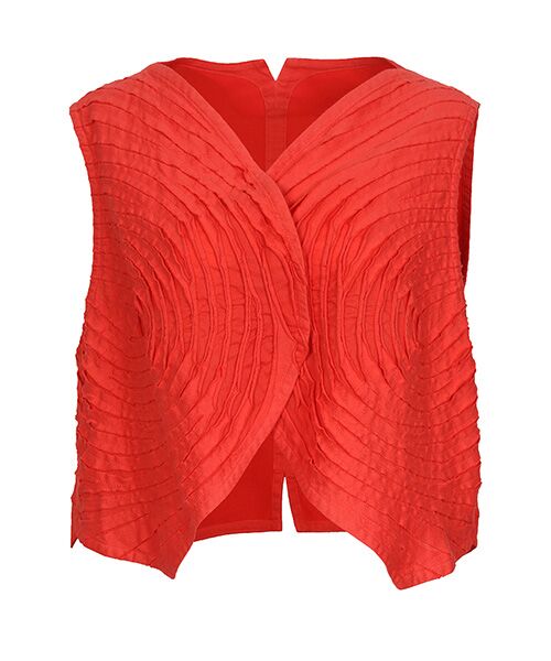雄大な富士山とたなびくウロコ雲の構図が美しい、北斎の『凱風快晴』に感じる臨場感を、スラッシュキルトのテクニックで表現したシリーズ。 雲の流れや渦潮を思わせる、半円の弧を描いたカットソー素材のコンパクトベスト。スラッシュキルトにより、カットソーの特性である生地の反り返りがランダムに起きることで、1着1着違う表情がうまれます。素材の個性と緻密なテクニックが織りなす、他にはないインパクトを楽しんで。 1枚プラスするだけでコーディネートをブラッシュアップさせる、振り幅とパワーを持ったアイテムです。