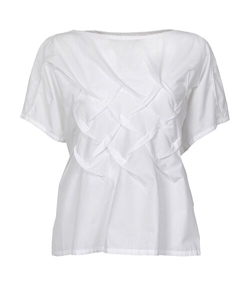 フロントで交互につまんだタックが新鮮な凹凸感を生むプルオーバーシャツ。立体的にクロスするディテールの個性的なインパクトに対し、全体はシンプルなTシャツデザインに。生地を重ねたような肩線は、パイピングで密かなデザインポイントになっています。タックでできる陰影や立体感で、ゆとりのあるシルエットも広がりすぎず、抜け感のあるちょうどいいボリューム。ベーシックに着回しできる、でも技が効いている、絶妙なバランス感覚をもった1枚です。