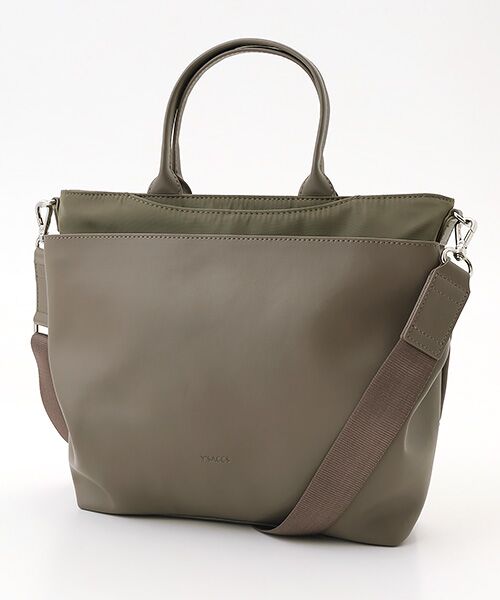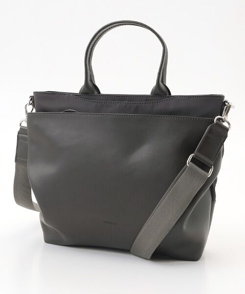 前面に大きくリサイクルレザーを配し、タックでドレープ感を出しながらリュクスな雰囲気に仕上げたバッグ。