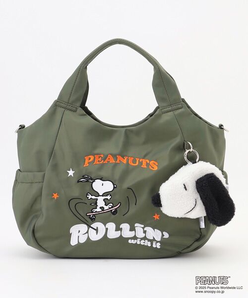 気軽に使えるナイロン素材に前面のスヌーピーのイラストの刺繍をあしらい、スヌーピーのフェイス型もこもこミニポーチがセットになったアイテム。