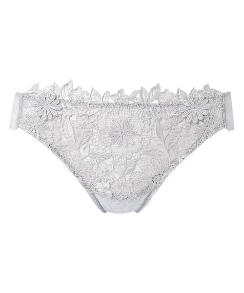 ●やさしくフィット バックはストレッチリバーレースで華やかに仕上げ、ヒップをやさしく包みこむスタイル・可憐な花々をクチュール感あふれるステッチで表現したケミカルレースにアップリケを重ねた立体的なデザイン