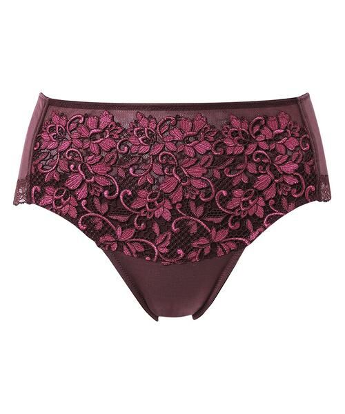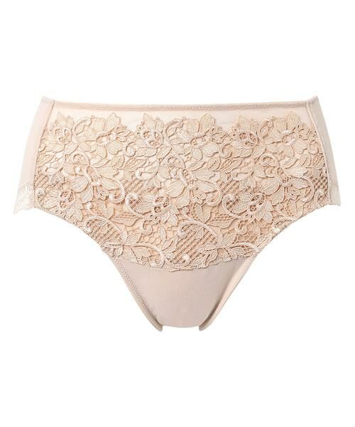 贅沢にあしらわれたケミカルレースのコントラストが優美なショーツ。フロント全体を彩る竹細工のような網模様のレースが繊細かつモダンな印象に。躍動感のある美しい曲線がラグジュアリーな魅力を引き立てます。身生地はやわらかくとろみのある肌ざわり。ほどよい安心感のあるはきこみ丈が特徴です。さまざまなシーンで着用できるシンプルなデザイン。