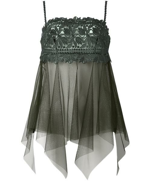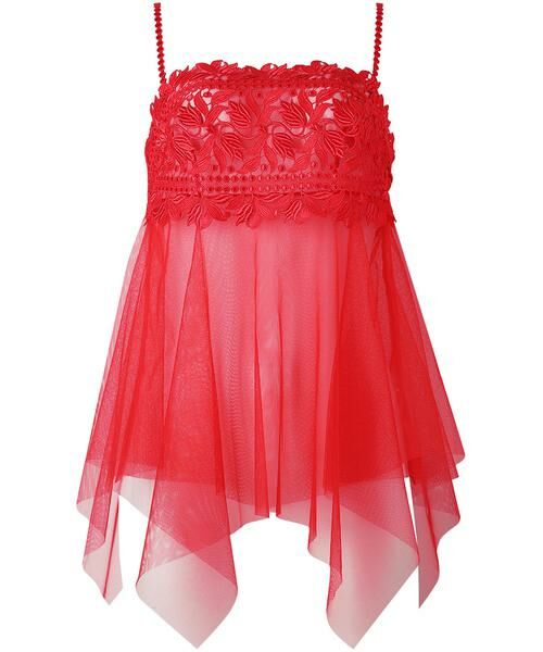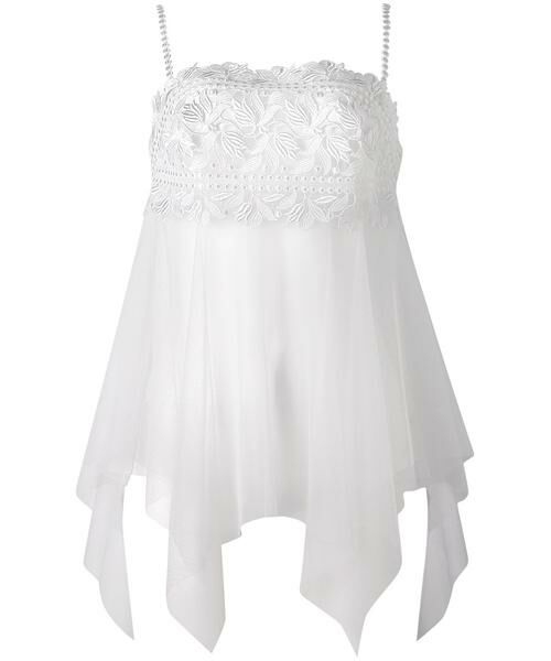 ランダムに重なり合うチュールが美しい、イレギュラーヘムキャミソール。整然としたステッチを効果的に使い、刺繡糸の光沢を生かしてパールの輝きを表現。伸びやかな植物モチーフを上品なきらめきで華やかに彩りました。上品な透け感があるボリューミィなスカート部分は、まるでドレスを着ているような気分に。シンプルとラグジュアリーの調和に心が躍る、ホリデーシーズンにぴったりの一枚です。