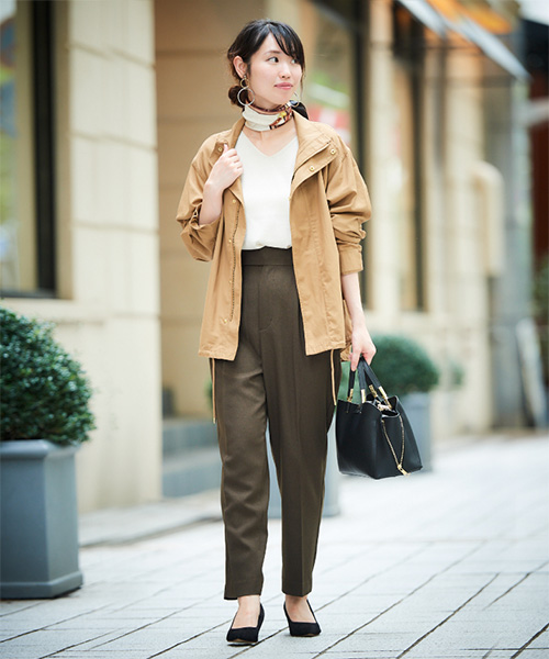 この時季に重宝するブルゾンをONスタイルに取り入れるなら、タックパンツとの合わせがおすすめ。Vネックニット×スカーフ使いで女性らしさをのぞかせて。