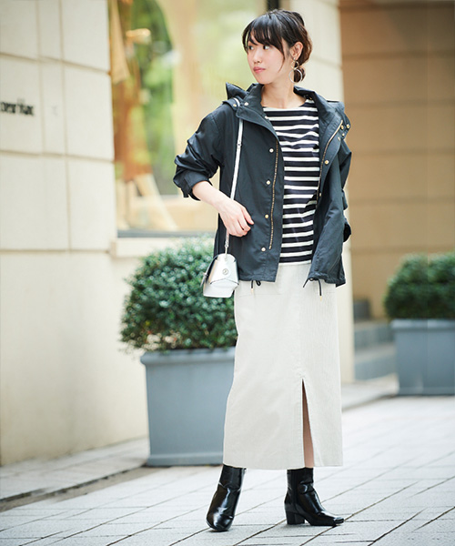 定番“フードブルゾン”をこの秋はモノトーンスタイリングで大人カジュアルに。秋らしいコーデュロイ素材のスカートやショートブーツで季節感をしっかりと。