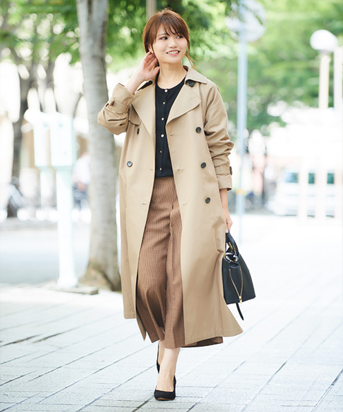 定番アウターの“トレンチコート”が今年らしくアップデート。程よく抜け感のあるオーバーシルエットに合わせて、ボトムスはトレンドのキュロットパンツを。ゴールドのボタンが上品なカーディガンをトップス使いできちっと感もプラス。
