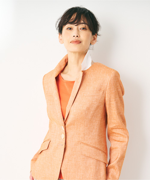 麻をベースにした素材で、ナチュラルな表情を味わうことができるテーラードジャケット。ウエストにシェイプを効かせ、やや着丈を短めにしたシルエットが女性らしく、スカートやワンピースとのコーディネートに最適です。裾がラウンドカットされており、ボタンを開けてさらりと羽織る着こなしも様になります。
