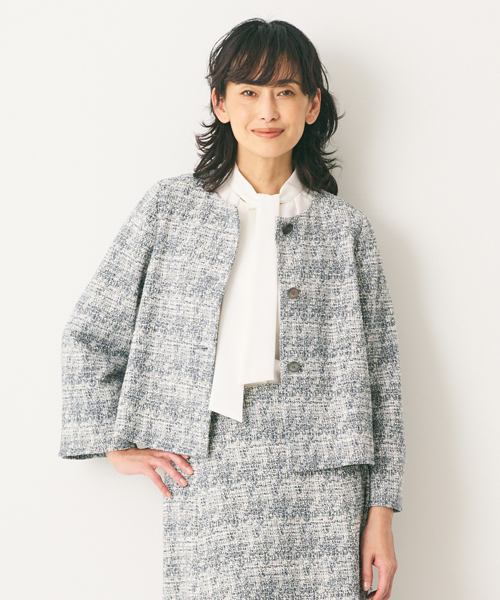 ツイード風ジャージーニットで仕立てたノーカラージャケットです。ツイードならではの上品さとジャージーならではの着心地の良さを両立。フロントのシェルボタンには、SCAPAのロゴがデザインされています。総裏仕立てで袖通ししやすく、きちんと感をしっかり備えた一着。同シリーズのスカートに合わせてエレガントなセットアップスタイルを楽しめます。