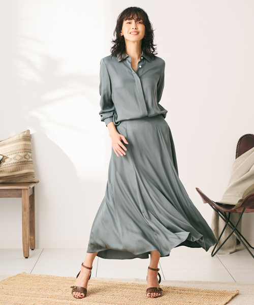 ほどよい光沢感はリッチで上品、落ち感あるシルエットには