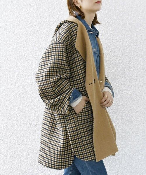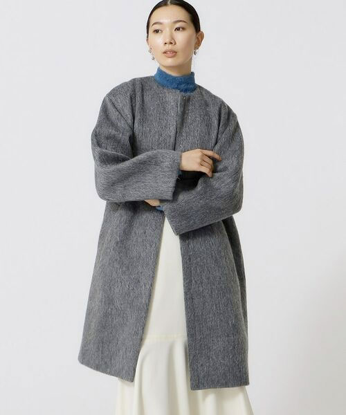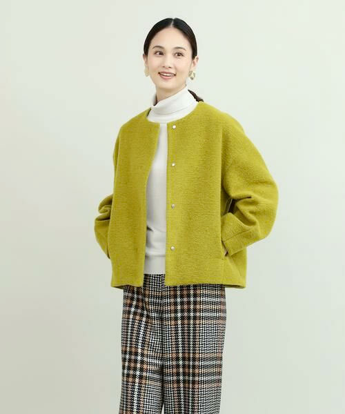 天然繊維とリサイクル素材を使用したサステナブル素材。 大きめの襟がポイントのコクーンシルエットは、パンツでもスカートでも決まる。ふかふかとして、重くないので羽織りやすい。