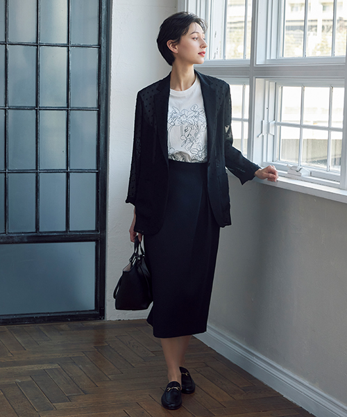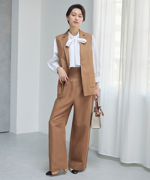 通勤やお出かけのスタンダードとして定着した、ジレセットアップ。ワントーンでさりげなく着こなすのが気分。きちんと感を大切にしたいシーンはエレガントなボウタイブラウスを。さらにトレンド感を楽しみたい人はシアーなカットソーとのレイヤードを。