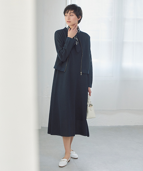 これからの季節に心地いい、さらりとした素材感のブルゾン&ノースリーブワンピース。グッドガールな雰囲気のポロカラーのワンピースは、カジュアルでありながらきちんと感があるのが魅力的。首元に同色のスカーフを巻いて、オールネイビーのルックに小粋な華をプラスして。