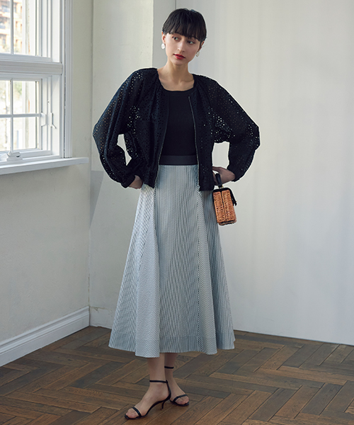 フェミニン×スポーティーのさじ加減が絶妙な、ANAYIらしいカットワークブルゾン。インナーのカラーを合わせれば、さりげなく大人っぽく透け感を引き立てることができます。ボトムも同カラーでまとめると地味になってしまうので、爽やかなシアーサッカー素材のフレアスカートを。