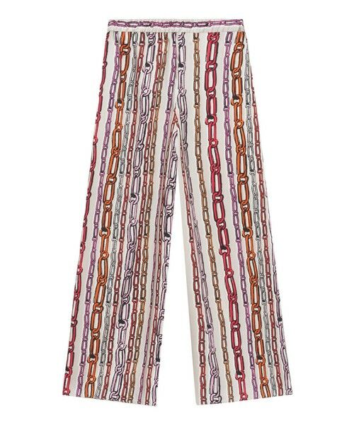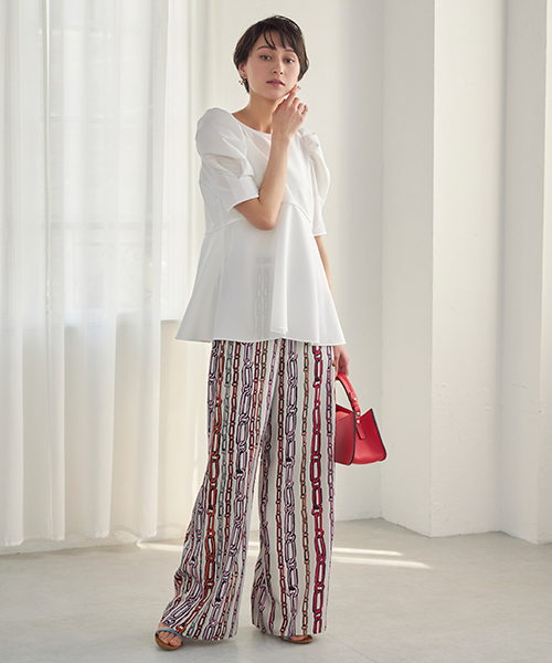 暖かくなる陽気に誘われて、華やかな色&柄を着たくなる今。気分の上がるお出かけや休日のランチにおすすめしたい、チェーンプリントのパンツを主役に。ホワイトの甘めブラウスを合わせてその個性をマイルドに。