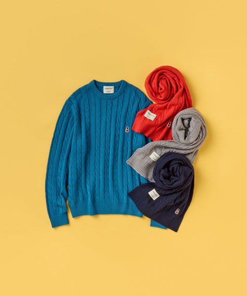 ウォッシャブルウールとアクリルをブレンドした混紡糸を使用したケーブルニット&マフラー。