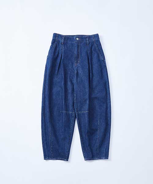 ライトオンスのリサイクルデニムのバレルパンツです。フロントに入ったタックとゆったりと裾につながるダーツで立体的でリラックス感のある分量に仕上げました。いつものスタイリングにプラスするだけでトレンド感のある着こなしが叶うデニムです。