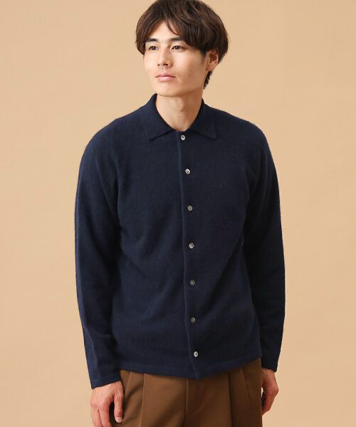 きちんと感のある襟付きカーディガン。前ボタンをすべてあけて、インナーにTシャツをあわせカジュアルに着こなしたり、同素材のカシミヤ ハイネックセーター(品番:CD2511)とのアンサンブルも楽しめます。※モデル着用はLサイズ