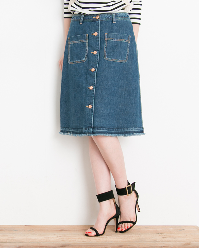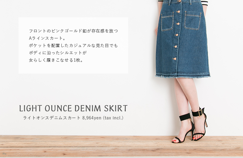 LIGHT OUNCE DENIM SKIRT フロントのピンクゴールド釦が存在感を放つAラインスカート。ポケットを配置したカジュアルな見た目でもボディに沿ったシルエットが女らしく履きこなせる1枚。