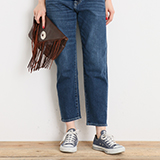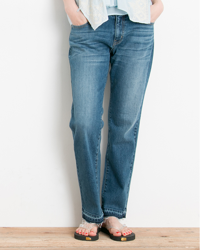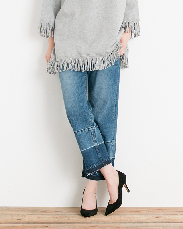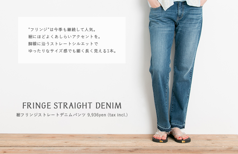 FRINGE STRAIGHT DENIM “フリンジ”は今季も継続して人気。裾にほどよくあしらいアクセントを。脚線に沿うストレートシルエットでゆったりなサイズ感で細く長く見える1本。