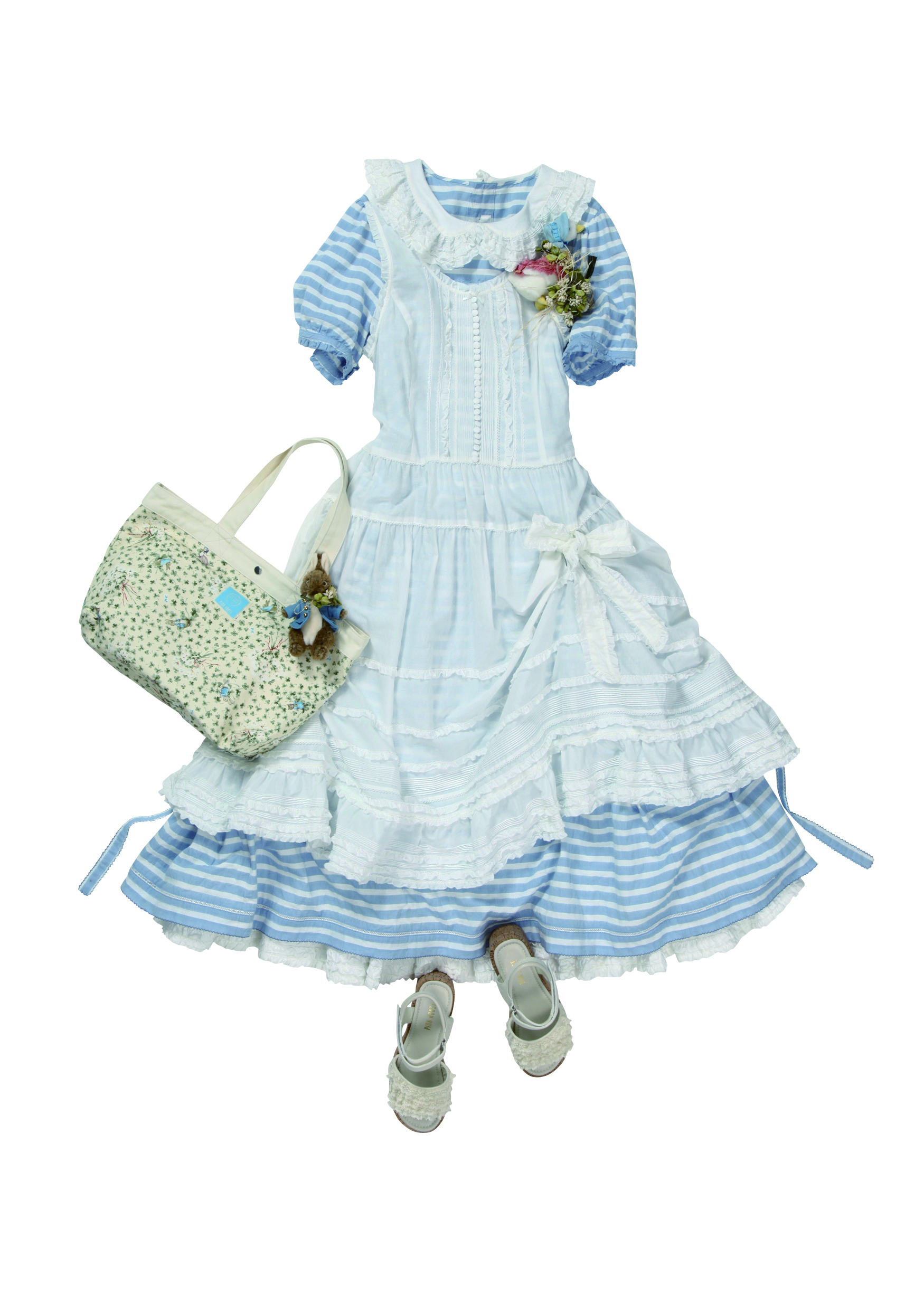 爽やかなサックスブルー×シロのボーダーが夏らしいからみボーダーのワンピース。 フランス製レースをあしらったローンの丸衿に合わせて、フリル感が素敵なエプロン風のタブリエを合わせてみました。 綺麗なサックスブルーが、ピーターのお洋服やジマイマのお帽子の色合いに似ているところもポイントです。 小物はもちろんピーターラビットシリーズで。キャンバス地にピーターラビットクローバープリントを施したトートバッグに、 ピーターとジマイマのぬいぐるみコサージュを付けて一緒にお出掛けに連れていってくださいね。