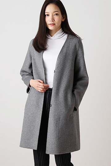 上質なウールの圧縮ジャージー素材が軽やかな印象。ウエストマークすれば女性らしいバランスのスタイリングが楽しめます。 ノーカラーガウンコートLOOK