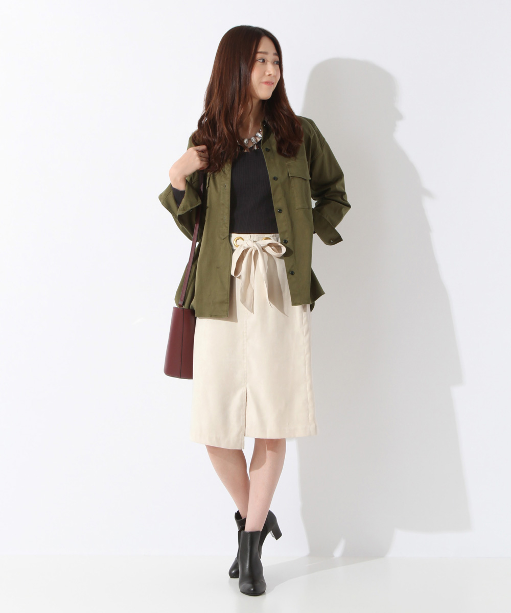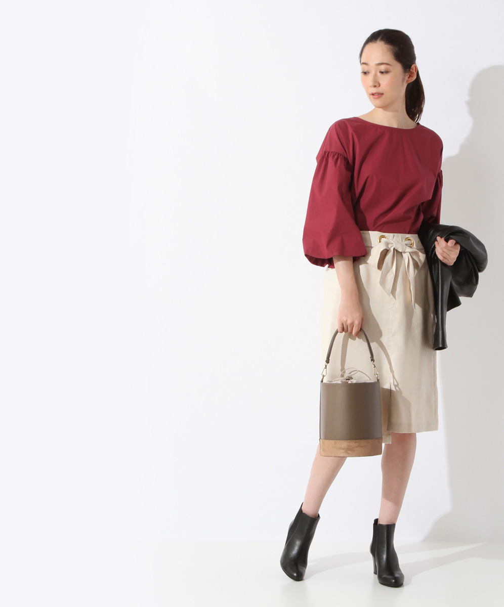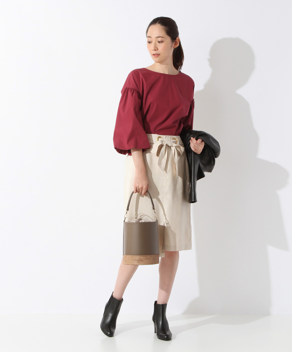 赤茶系のブラウンが今秋らしいスエード調スカート。ウエストにはハトメを使用し、デザインポイントに。程よいゆとりとすっきりシルエットを実現したラップ風のデザインは女性らしい印象に仕上げてくれます。