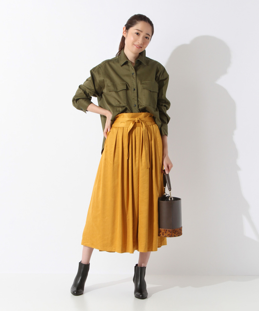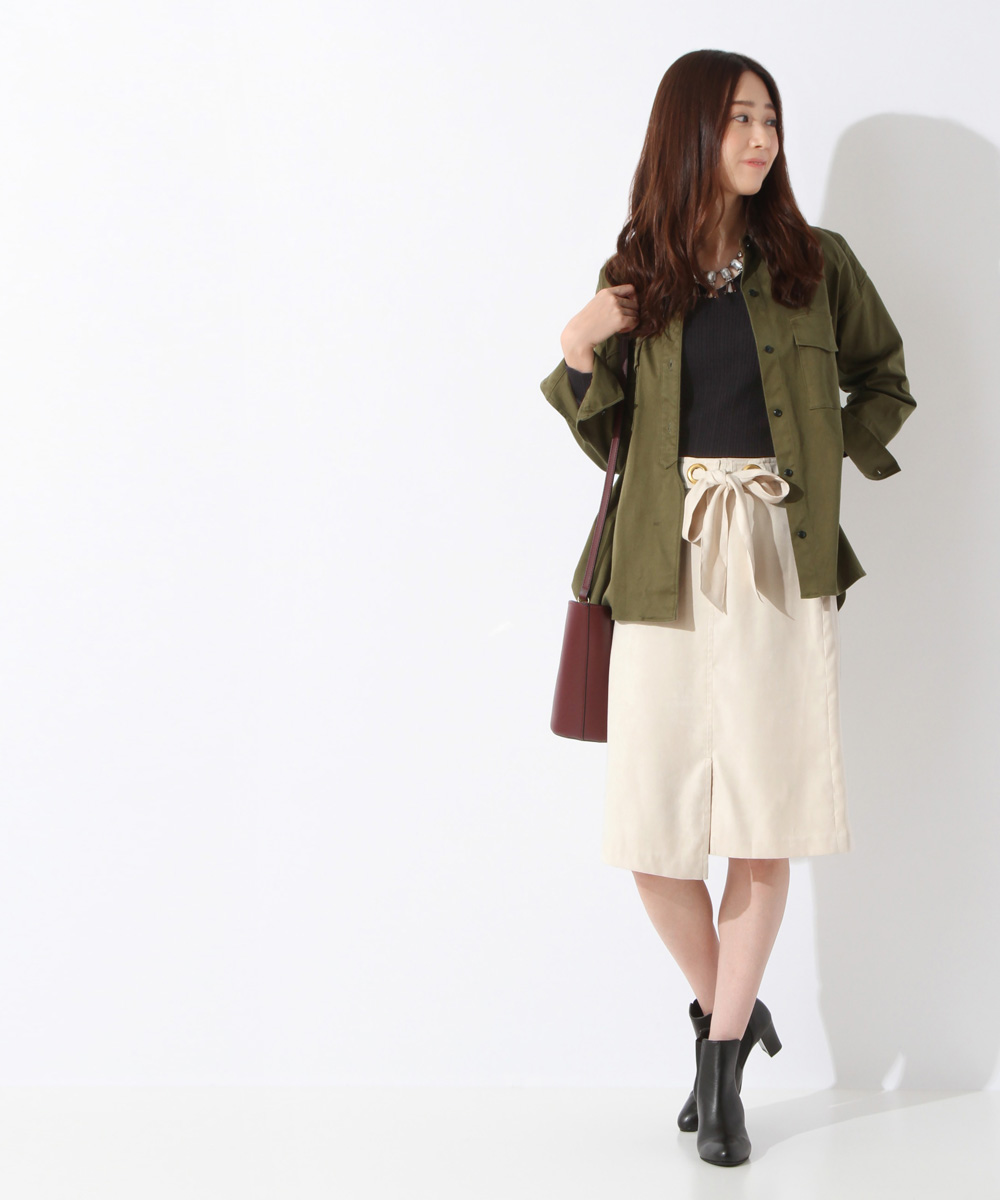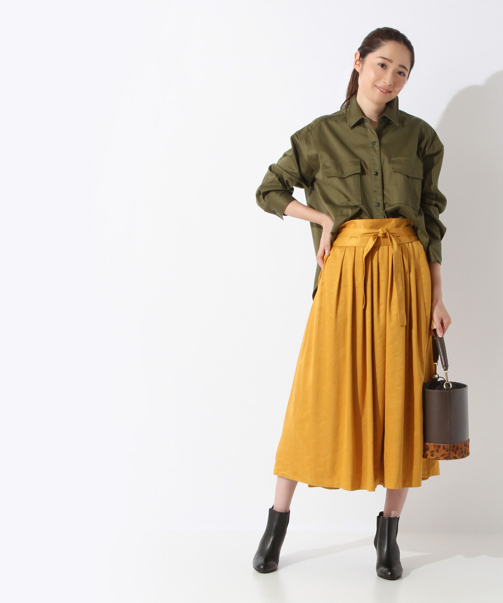 赤茶系のブラウンが今秋らしいスエード調スカート。ウエストにはハトメを使用し、デザインポイントに。程よいゆとりとすっきりシルエットを実現したラップ風のデザインは女性らしい印象に仕上げてくれます。