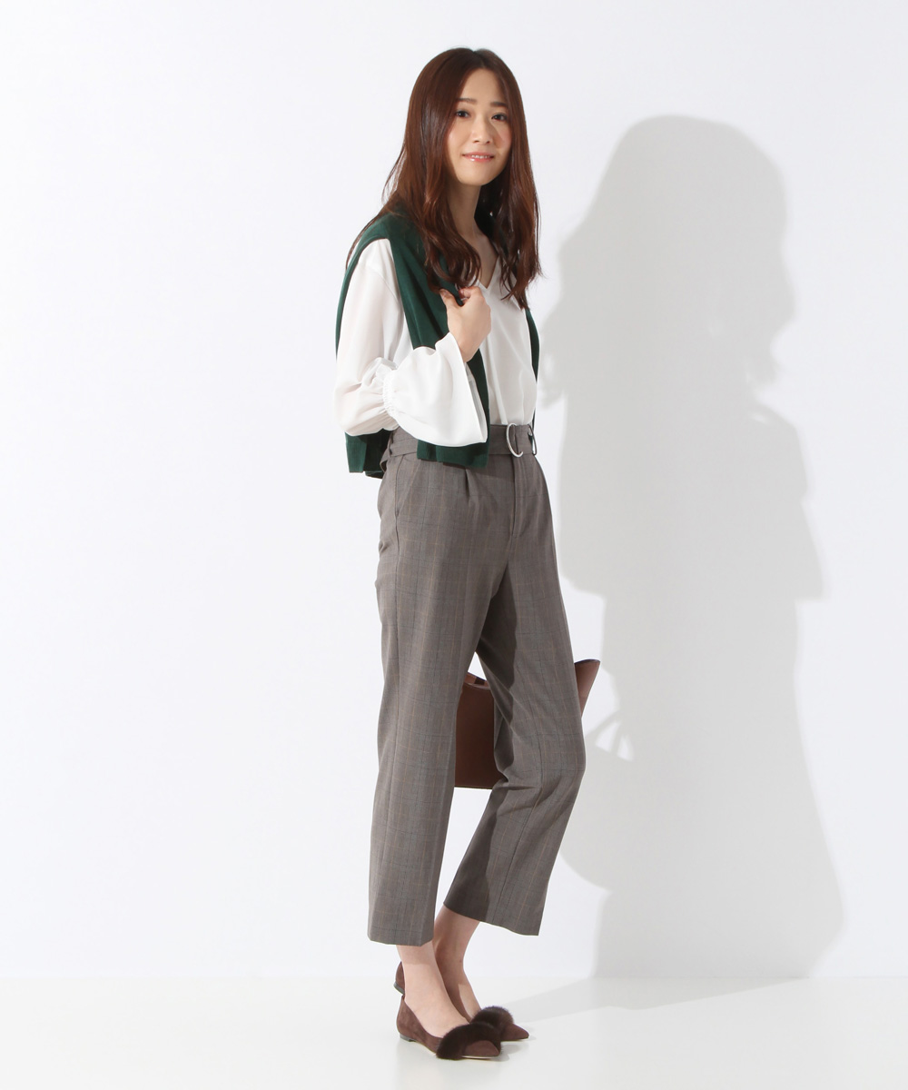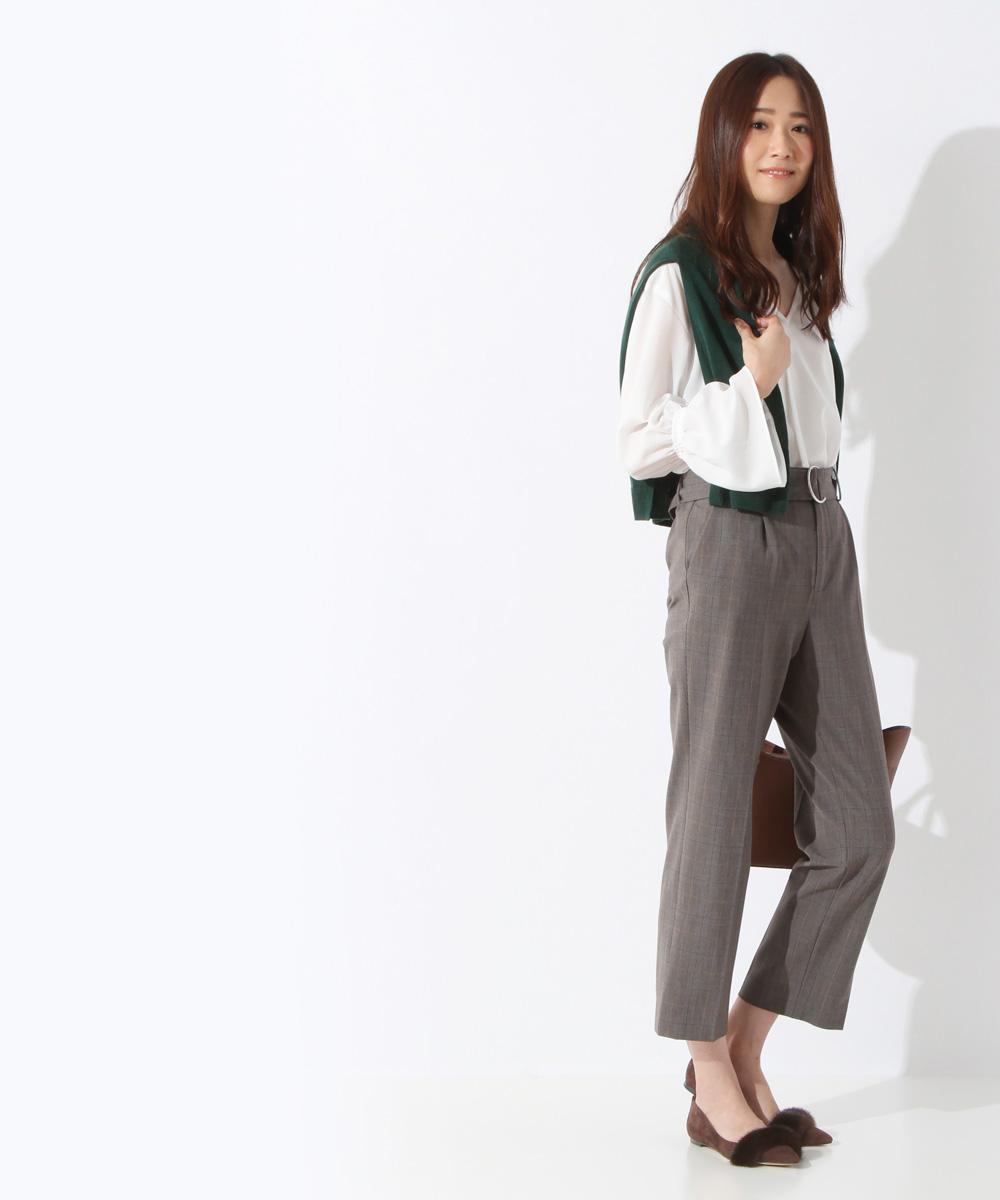 程良い開きのVネックがオトナな雰囲気のブラウス。お袖のギャザーディティールが今年らしいデザインです。前後差のある裾はサイドに切り込みが入っているので、前だけボトムにインしても決まります。
