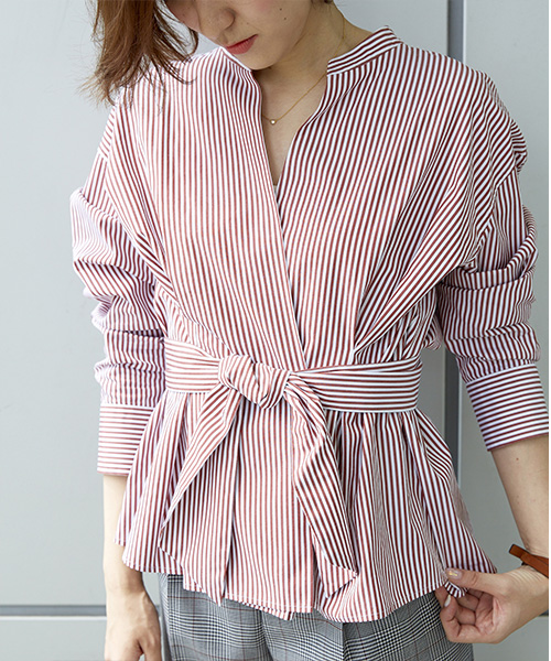 ボトムを合わせて。 イタリア素材のシャツは前結びデザインが新鮮。柄×柄
