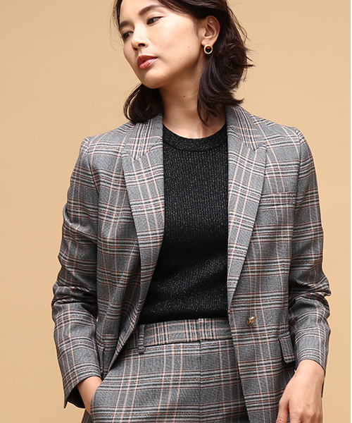 は、愛知県の尾州で作られたロペのオリジナル。 注目のスーツスタイルに、ナチュラルなバンブーバッグがクラシカルな表情を際立たせます。