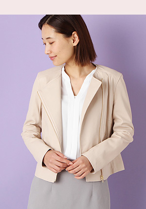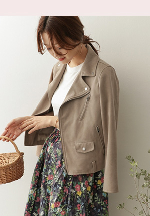 人気の理由春らしい柔らかな印象のフェイクスエード素材のライダース。ライダースのハードさが苦手な人にもオススメです。肌寒い時期はアウターの中に着ても。