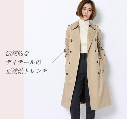 人気の理由正統派のトレンチコートは、伝統と上質を。エジプト産・高級綿の一つ、フィンクスコットンのツイル素材を使用し、程良くシェイプしたシルエットで、クラシックで女性らしい雰囲気が特長です。
