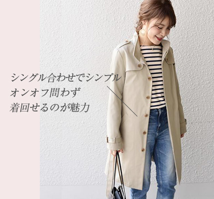 人気の理由トレンチはトレンチでも、シングルの仕様が新鮮な1枚。すっきりとシンプルで、ONOFF問わず、さまざまなシーンで着回せるデザインです。