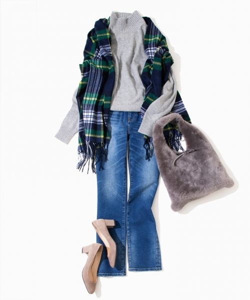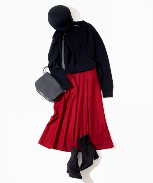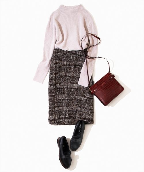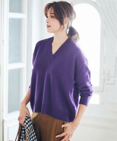 深みのあるバイオレットカラー×キャメルボトムで今っぽい雰囲気に。