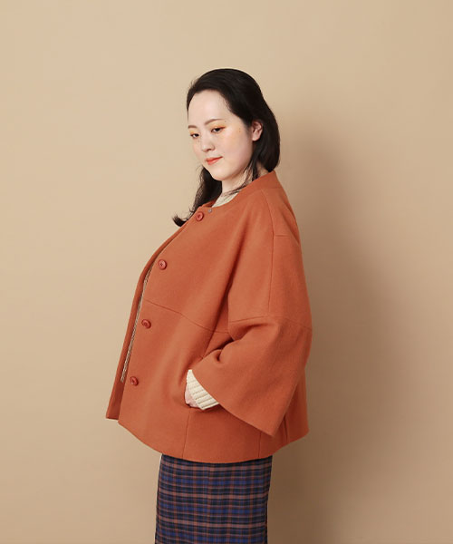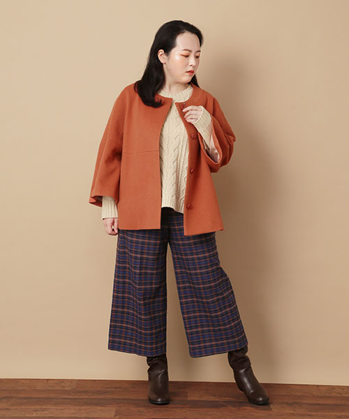 これから活躍するショートコートのコーディネート。コンパクトな襟元と、短めのボリューム袖がクラシカルな雰囲気です。チェックパンツはクロップト丈のものを合わせてトレンド感をプラスして。